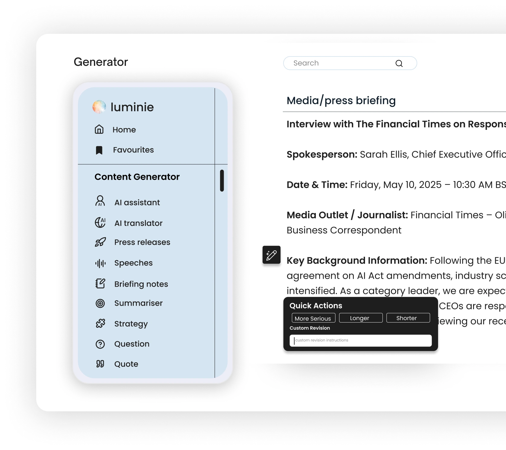 Craft press releases, internal briefings, and comms strategies in minutes — not hours. luminie helps you move faster, stay on-message, and elevate every word.
